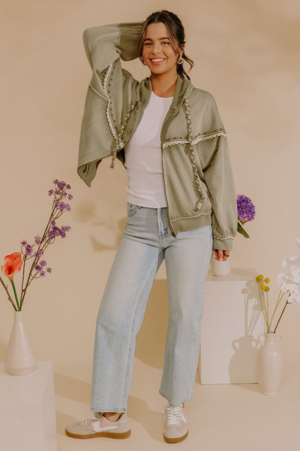- Cozy meets cute in this darling hoodie! Featuring charming scalloped details and standout studs, it's the perfect piece to add playful style to your wardrobe. - Unlined vintage washed material - A round neckline with a hooded back featuring a braided drawstring - Cream colored accents - Front zip closure - Brass-toned studs and scalloped accents at the upper bodice - Long sleeves with scalloped accents - Functional side pockets - A relaxed silhouette that ends in a straight hem